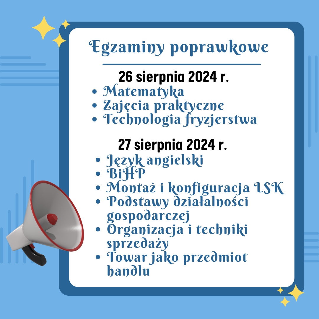 Wszystkie egzaminy poprawkowe, bez względu na dzień, zawód i przedmiot, odbędą się w Piaskach o godzinie 8:00.