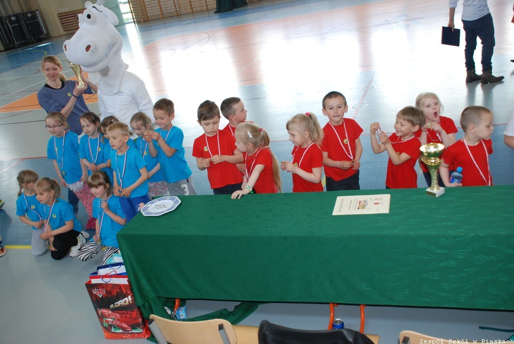Jak co roku dzielnych przedszkolaków wspierali starsi koledzy z Gimnazjum nr 1 i Zespołu Szkół w Piaskach. Emocji nie brakowało. Głównym celem tej imprezy było rozwijanie sprawności fizycznej dzieci oraz propagowanie aktywnego spędzania czasu. Przedszkolaki uczestnicząc w olimpiadzie miały okazję wdrożyć się do przestrzegania reguł oraz poznania zasad zdrowej sportowej rywalizacji. Podczas udziału w poszczególnych konkurencjach dzieci miały okazję zintegrować się ze sobą, jak również zapoznać się z przedszkolakami z sąsiednich miejscowości. Po przejściu wszystkich konkurencji sportowych naszedł moment poczęstunku, aby powróciły siły. Spartakiadę urozmaicały występy taneczne oraz pokaz iluzjonistyczny. Następnie miał miejsce przez wszystkich oczekiwany moment – ogłoszenie wyników oraz wręczenie medali i dyplomów dla wszystkich zawodników. Każdy był zwycięzcą!