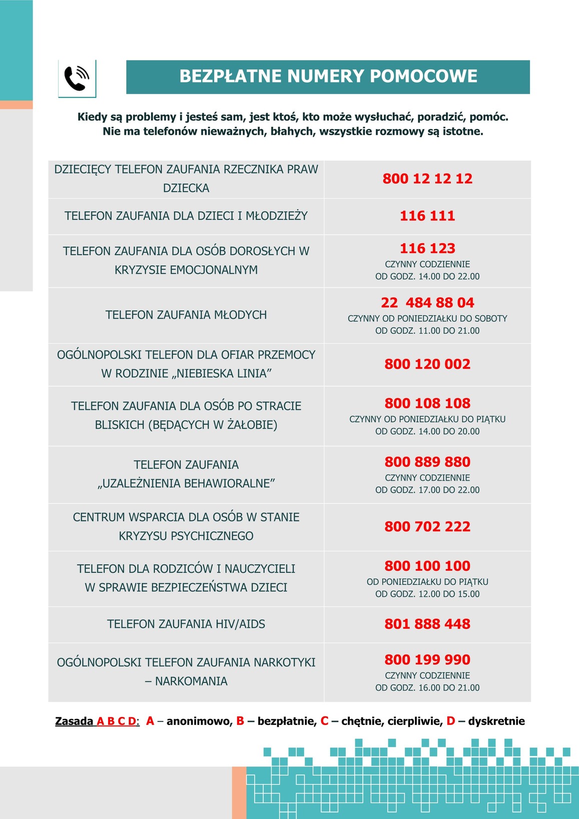 Rozpoczynamy nowy rok szkolny, rok pełen wyzwań i oczekiwań. Jeśli będziesz potrzebował pomocy, zawsze możesz zwrócić się do wychowawcy, nauczyciela czy pedagoga szkolnego lub szukać pomocy wśród specjalistów dostępnych pod bezpłatnymi numerami pomocowymi.