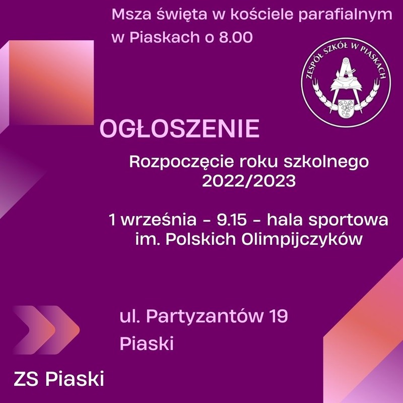 Nowy rok szkolny 2022/2023 rozpoczniemy 1 września o 9.15 spotkaniem wszystkich uczniów i ich rodziców z Panem Dyrektorem Waldemarem Szałkiem. Przed uroczystą inauguracją roku szkolnego w kościele parafialnym odbędzie się msza święta o 8.00.