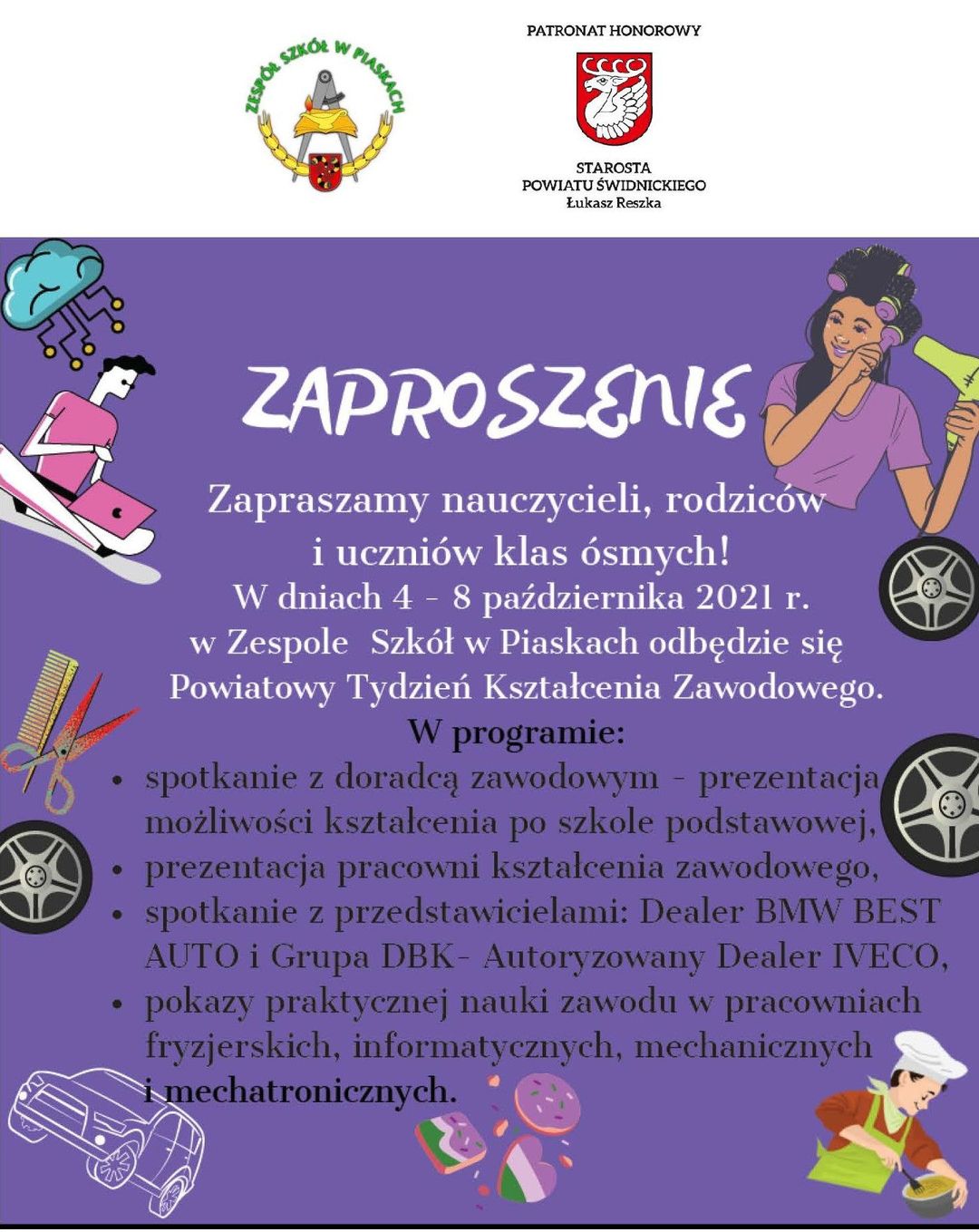 Od 4 do 8 października 2021 r. w Zespole Szkół w Piaskach odbędzie się Powiatowy Tydzień Kształcenia Zawodowego.