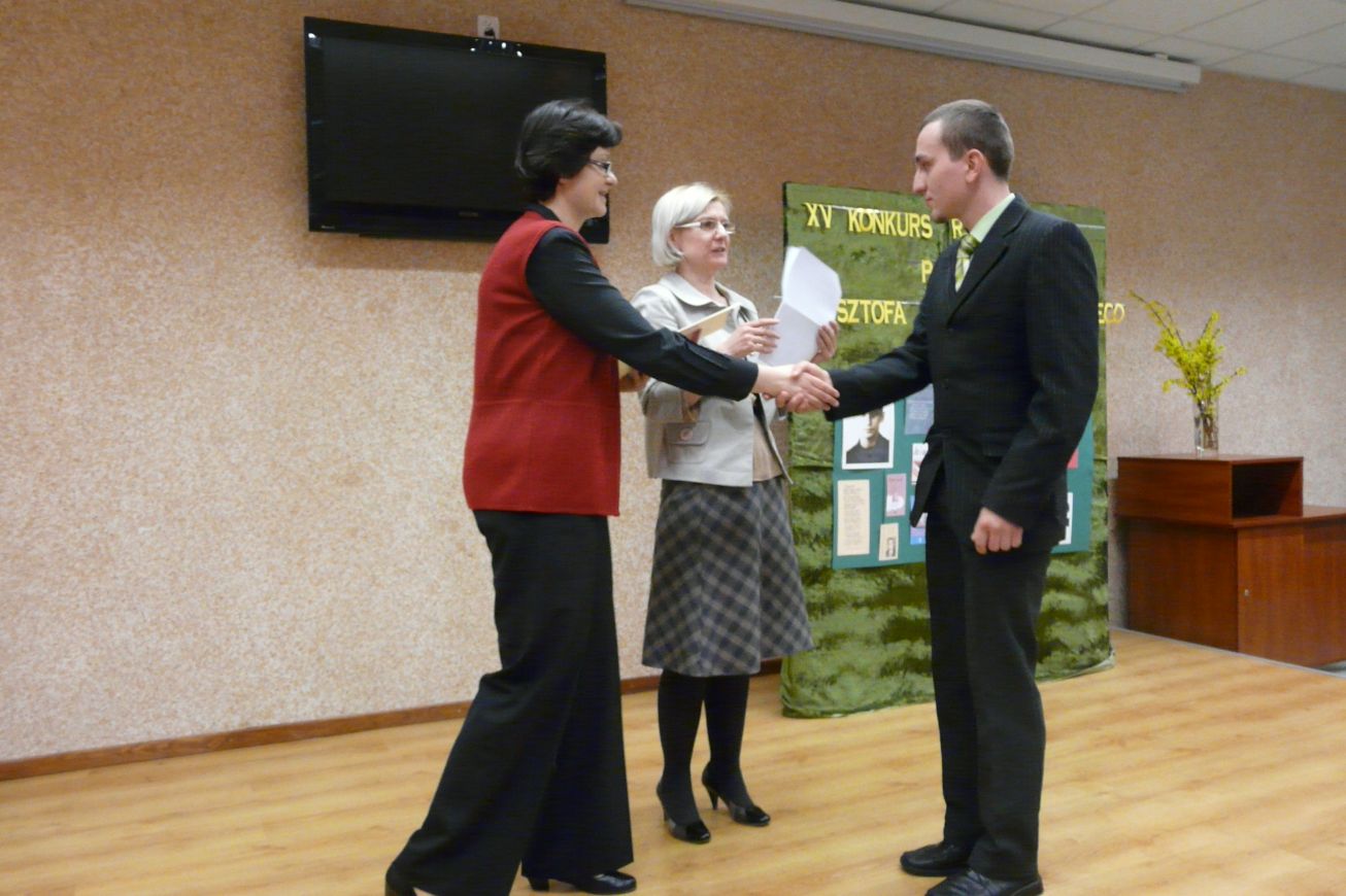 Z radością informujemy, że Patryk Borowicz, uczeń klasy II ZSZ został laureatem jubileuszowego, XV Powiatowego Konkursu Recytatorskiego im. Krzysztofa Kamila Baczyńskiego. Jury turnieju doceniło jego interpretację wierszy Byłeś jak wielkie stare drzewo K. K. Baczyńskiego i Który skrzywdziłeś Czesława Miłosza, przyznając uczniowi naszej szkoły trzecie miejsce w kategorii szkół ponadgimnazjalnych.